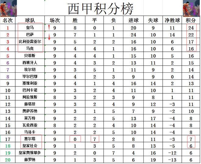 積分榜方面,擊敗赫塔菲后皇馬再次重啟連勝模式,再超過巴薩2分奪回榜首。比利亞雷亞爾差皇馬7分排在第3,馬競(jìng)差皇馬8分排在第4。塞爾塔今天又平了,妥妥的平局王,9輪就平了7場(chǎng),還沒有拿到賽季首勝的他們只比降級(jí)區(qū)高了1分。