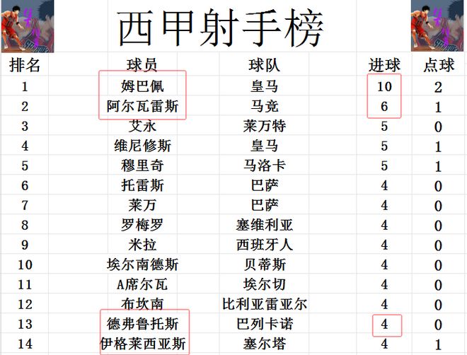 射手榜方面,姆巴佩和哈蘭德現(xiàn)在是隔空較起了勁,哈蘭德8輪打入11球,姆巴佩今天打入絕殺球后9輪打入10球,也上了雙。西甲第2和英超第2都一樣,阿爾瓦雷斯打入6球。維尼修斯,艾永和穆里奇5球并列第3。德弗魯托斯今天梅開二度后,追上萊萬,托雷斯等人4球剛好擠入前十。